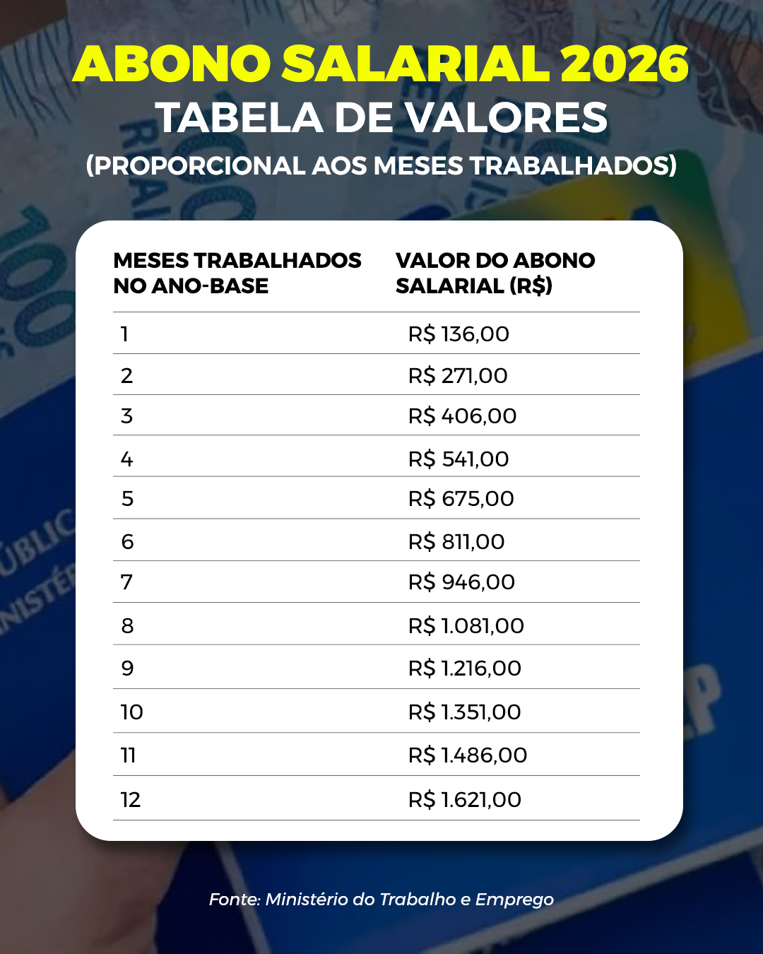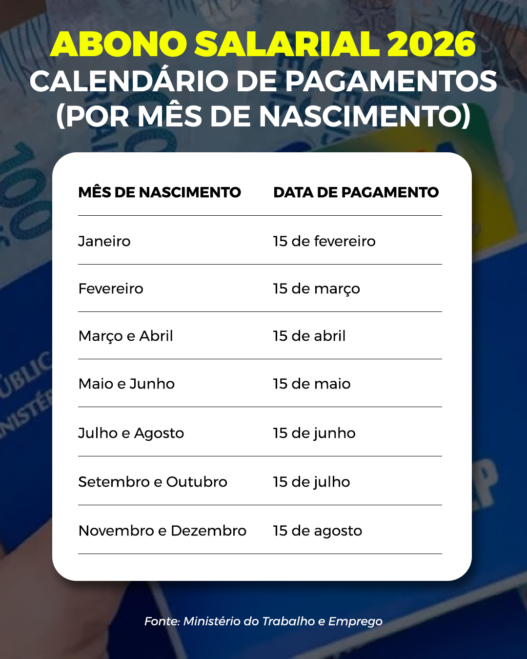 O valor do benefício é calculado à razão de 1/12 do salário mínimo vigente para cada mês trabalhado no ano-base. Os pagamentos seguem o calendário de nascimento do trabalhador e vão até 15 de agosto. Os valores poderão ser sacados até 29 de dezembro de 2026.